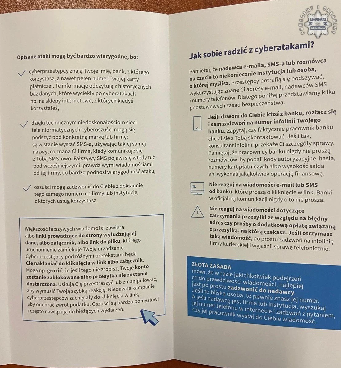 Dzielnicowy podczas spotkań zwrócił szczególną uwagę na konieczność rozmowy z rodziną i ostrzeganiu bliskich przed tego typu przestępstwami. Mieszkańcy otrzymali ulotki informacyjno-edukacyjne, które dzięki współpracy Komendy Głównej Policji i Powszechnego Zakładu Ubezpieczeń mogą służyć jako informator.