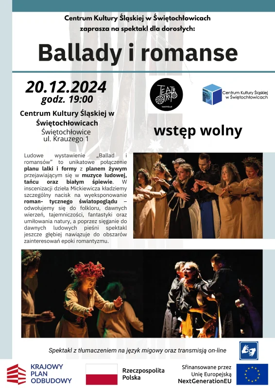 Centrum Kultury Śląskiej w Świętochłowicach zaprasza wszystkich dorosłych na niezwykłe wydarzenie – spektakl „Ballady i romanse” w wykonaniu Teatru Trip. Spektakl odbędzie się 20 grudnia 2024 roku o godzinie 19:00 w Centrum Kultury Śląskiej, przy ul. Krauzego 1. Wstęp na wydarzenie jest wolny.