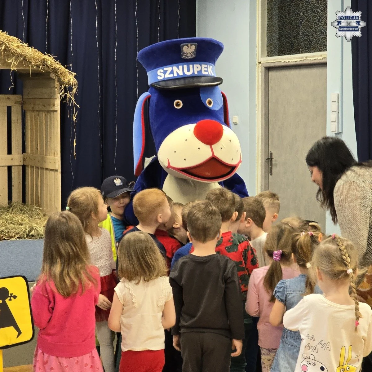 Na zakończenie spotkania na przedszkolaków czekała miła niespodzianka – wizyta psa Sznupka, policyjnej maskotki. Były wspólne zdjęcia, uśmiechy oraz chwile radości z ulubieńcem dzieci. Spotkanie przebiegło w bardzo serdecznej atmosferze i było doskonałą okazją do nauki poprzez zabawę, a zdobyta wiedza z pewnością pomoże najmłodszym bezpiecznie spędzać zimowy czas.