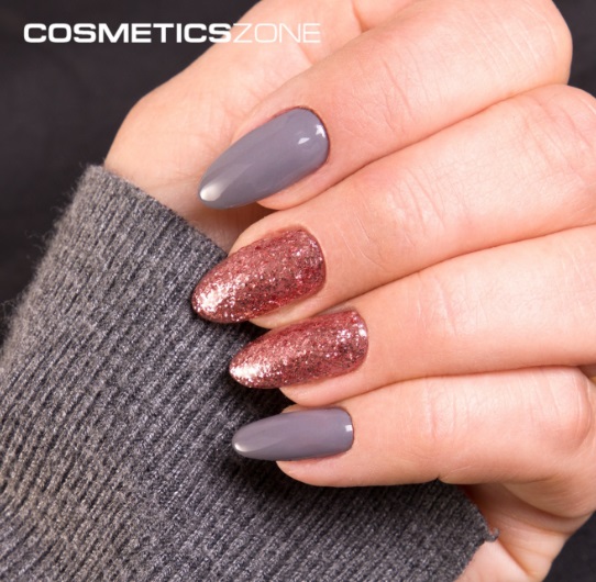 Lakier hybrydowy różowe złoto fantastycznie komponuje się z gołębią szarością