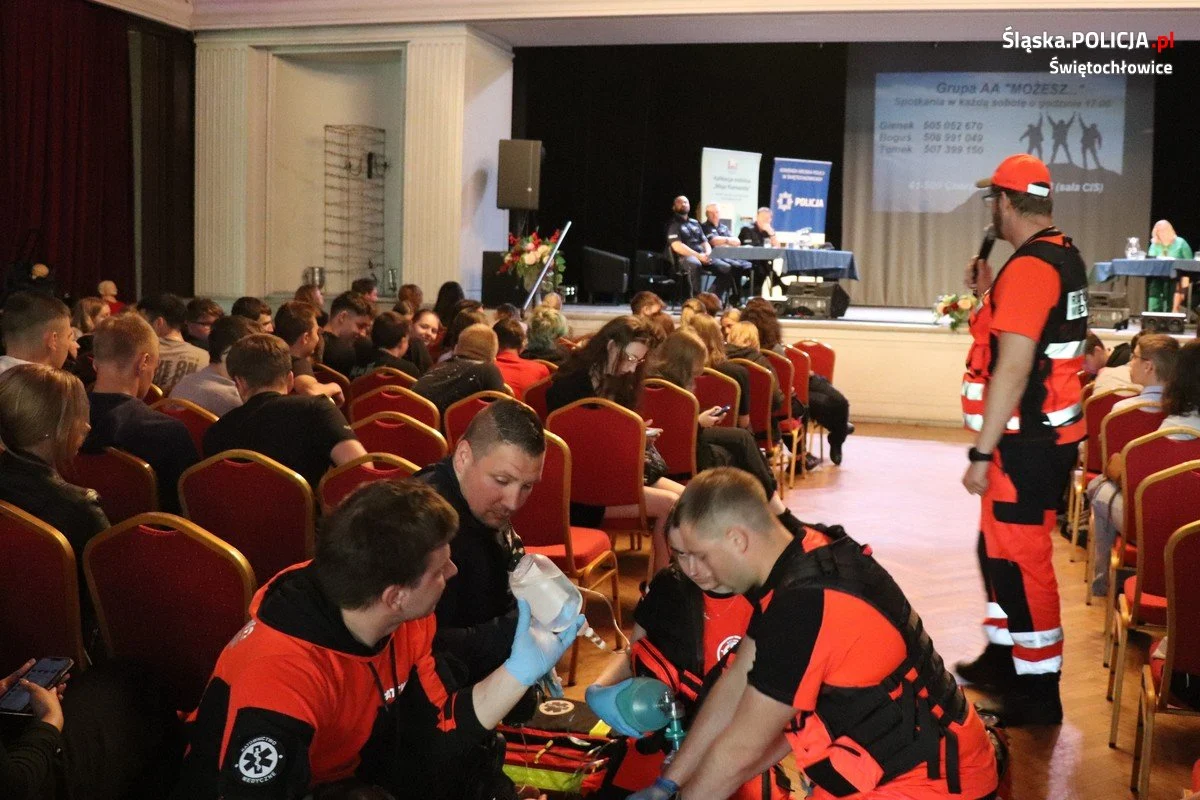 Świętochłowiccy mundurowi, którzy w swoim zakresie posiadają przeszkolenie kwalifikowanej pierwszej pomocy, przy wsparciu medyków z Harcerskiego Klubu Ratowniczego z Tarnowskich Góry zaprezentowali i omówili procedurę postępowania przy zaistnienia takiego zdarzenia.