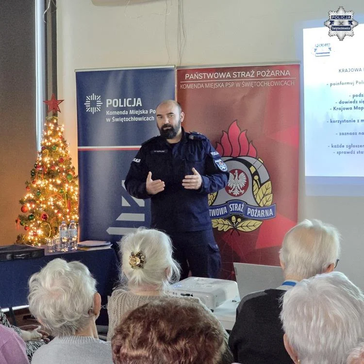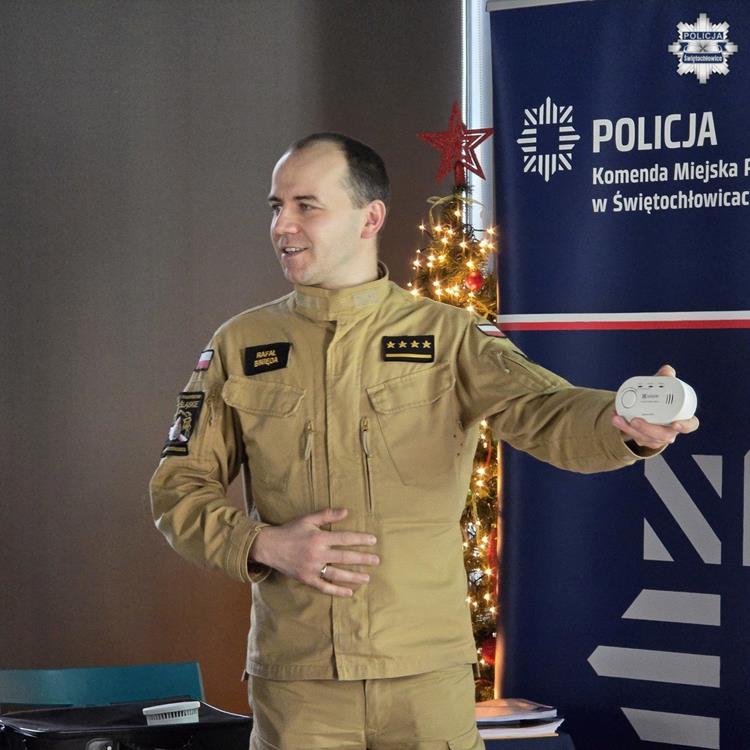 Kolejnym ważnym tematem, który poruszył starszy kapitan Rafał Binięda z Państwowej Straży Pożarnej w Świętochłowicach, były zagrożenia pożarowe. Funkcjonariusz zaprezentował kampanię „Czujnik na straży Twojego bezpieczeństwa”, która ma na celu podniesienie świadomości mieszkańców na temat zagrożeń związanych z pożarami oraz zatruciem tlenkiem węgla. Przypomniano także o konieczności instalowania czujników dymu i tlenku węgla w domach.