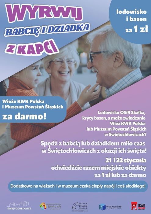 „Wyrwij babcię i dziadka z kapci” to wydarzenie organizowane z okazji Dnia Babci i Dziadka, które umożliwia aktywne spędzenia czasu z najbliższymi. Ogromną zaletą jest to, że w Dniu Babci i w Dniu dziadka w ramach wydarzenia można odwiedzić różnego rodzaju miejskie obiekty za darmo lub za symboliczną złotówkę. Co i kiedy można odwiedzić?