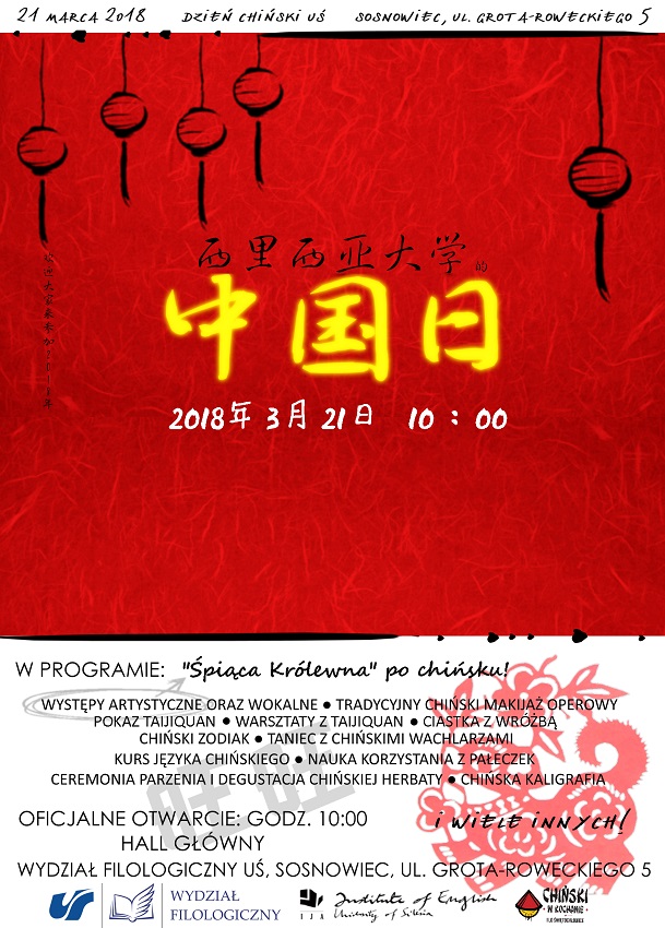 21 marca br. w holu głównym budynku Wydziału Filologicznego Uniwersytetu Śląskiego (Sosnowiec, ul. Grota Roweckiego 5) o godzinie 10 odbędzie się Dzień Chiński, w którego organizację zaangażowały się także klasy z językiem chińskim I LO im. Jana Kochanowskiego w Świętochłowicach.