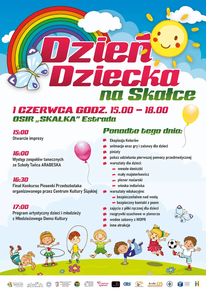 Już od godziny 15.00 OSiR Skałka zaprasza na wspólne świętowanie wokół sceny. Na dzieci czekać będą takie atrakcje jak m.in. gry i zabawy, animacje, kolorowe piniaty, warsztaty “wesołe doniczki” czy “mały majsterkowicz”. Wioska indiańska i plener malarski także ucieszą najmłodszych. Dzieci nauczą się bezpieczeństwa nad wodą i kontaktu z psem.