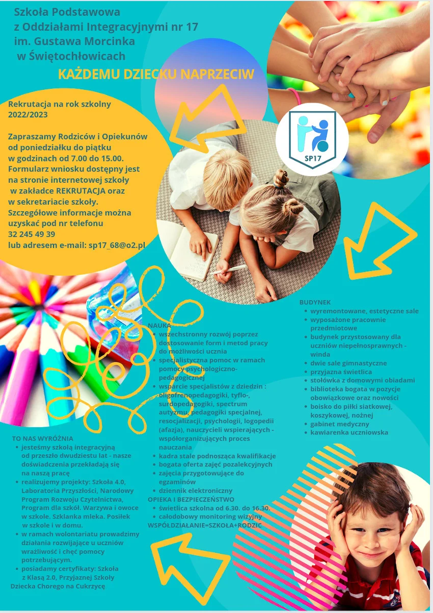 W związku z trwającą rekrutacją do klas pierwszych w świętochłowickich szkołach podstawowych zachęcamy do zapoznania się z propozycją Szkoły Podstawowej z Oddziałami Integracyjnymi nr 17.