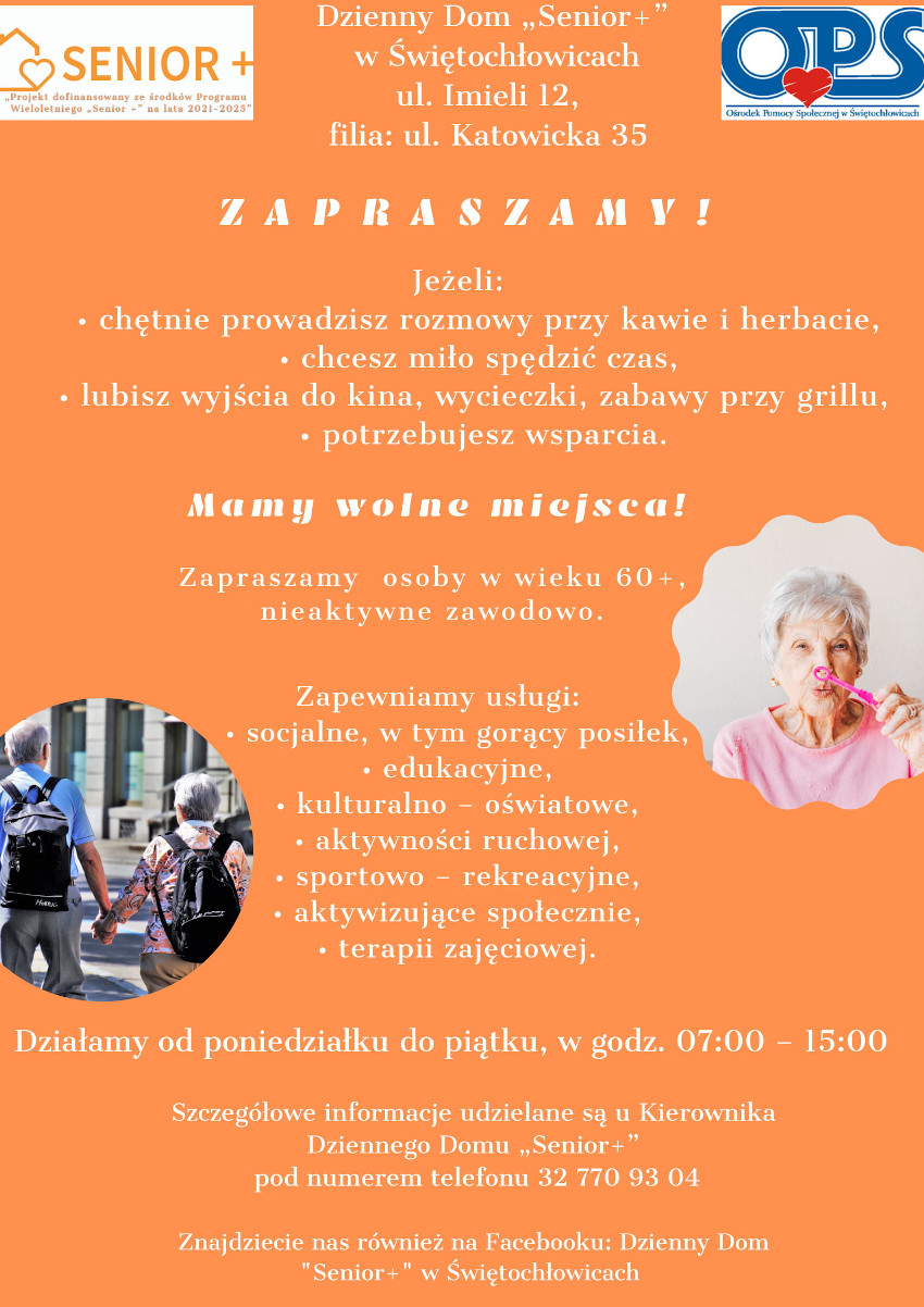 Dzienny Dom “Senior+” jest jednostką podległą Ośrodkowi Pomocy Społecznej w Świętochłowicach, mieści się w Świętochłowicach przy ulicy Imieli 12 wraz z filią przy ulicy Katowickiej 35. Dom czynny jest od poniedziałku do piątku w godzinach od 7.00 do 15.00. Ze świadczeń Dziennego Domu mogą korzystać osoby skierowane na podstawie decyzji administracyjnej wydanej przez Dyrektora Ośrodka Pomocy Społecznej w Świętochłowicach – zwłaszcza osoby w wieku emerytalnym, o zmniejszonej sprawności psychofizycznej oraz znajdujące się w trudnej sytuacji materialnej. Dzienny Dom “Senior+” posiada obecnie wolne miejsca (szczegóły na plakacie poniżej)
