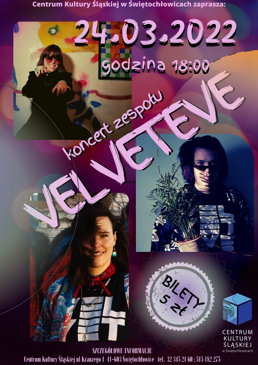 W czwartek 24 marca o godzinie 18:00 serdecznie Centrum Kultury Śląskiej w Świętochłowicach zaprasza na koncert zespołu VELVETEVE czyli Eva Aksamit.