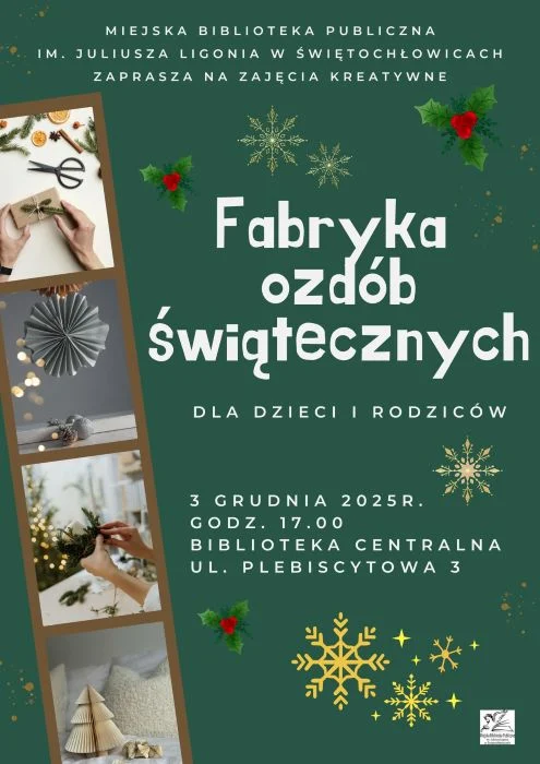 Świętochłowice szykują świąteczną niespodziankę dla najmłodszychmieszkańców i ich opiekunów. Miejska Biblioteka Publiczna im. Juliusza Ligonia zaprasza na wyjątkowe zajęcia kreatywne „Fabryka ozdób świątecznych”. To świetna okazja, by wspólnie przygotować dekoracje, poczuć magię zbliżających się świąt i spędzić rodzinny czas w twórczej atmosferze.