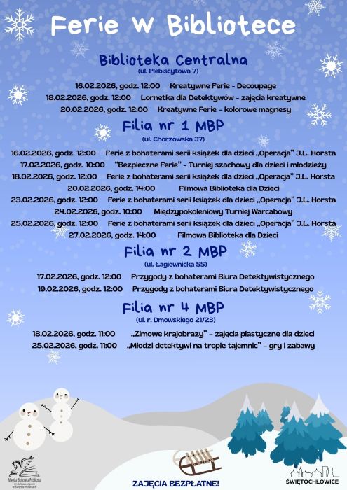 Miejska Biblioteka Publiczna w Świętochłowicach zaprasza na ferie zimowe pełne kreatywnych, edukacyjnych i integracyjnych atrakcji.