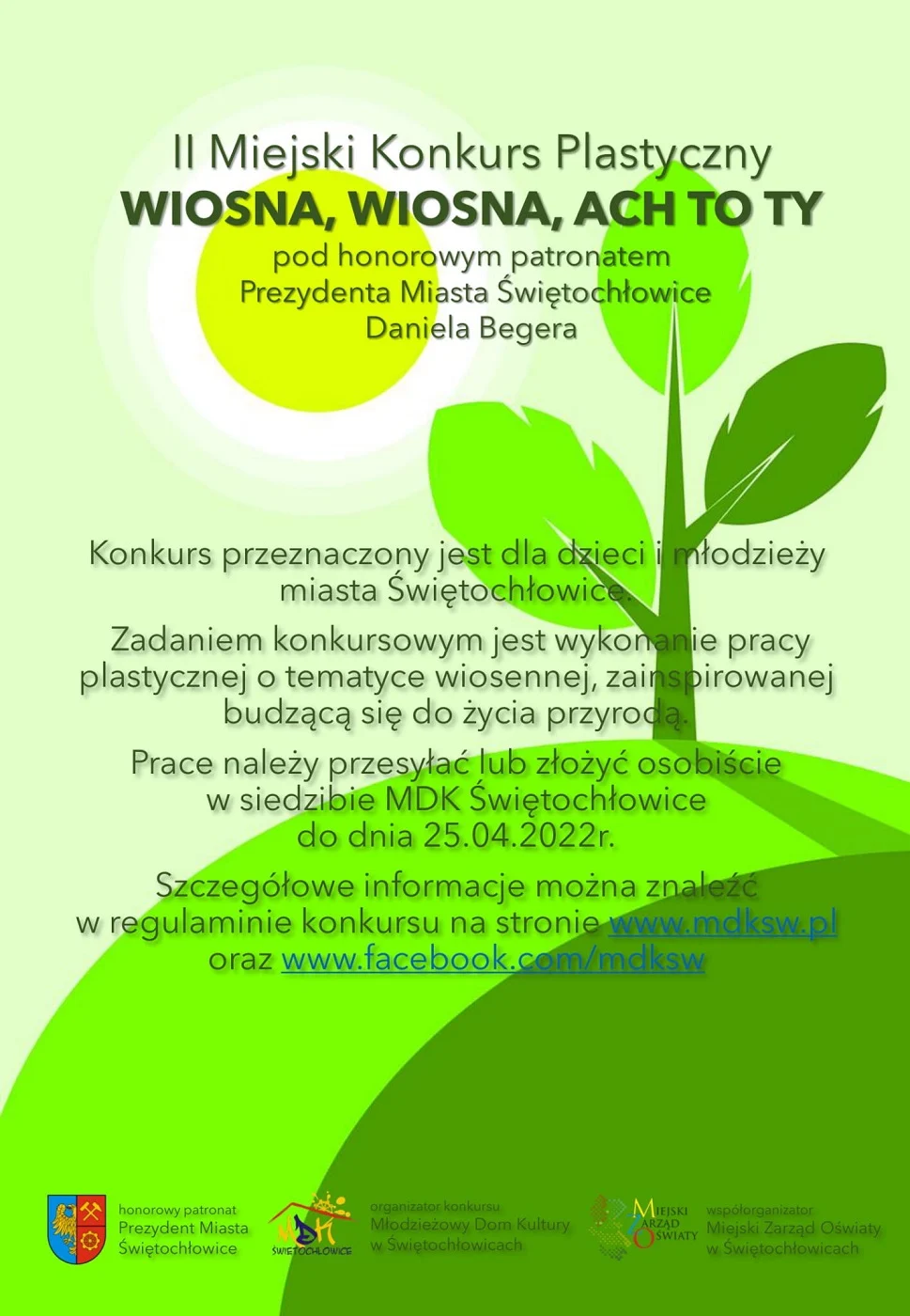 Młodzieżowy Dom Kultury w Świętochłowicach ogłasza II Miejski Konkurs Plastyczny „Wiosna, wiosna, ach to Ty” pod honorowym patronatem Prezydenta Miasta Świętochłowice.