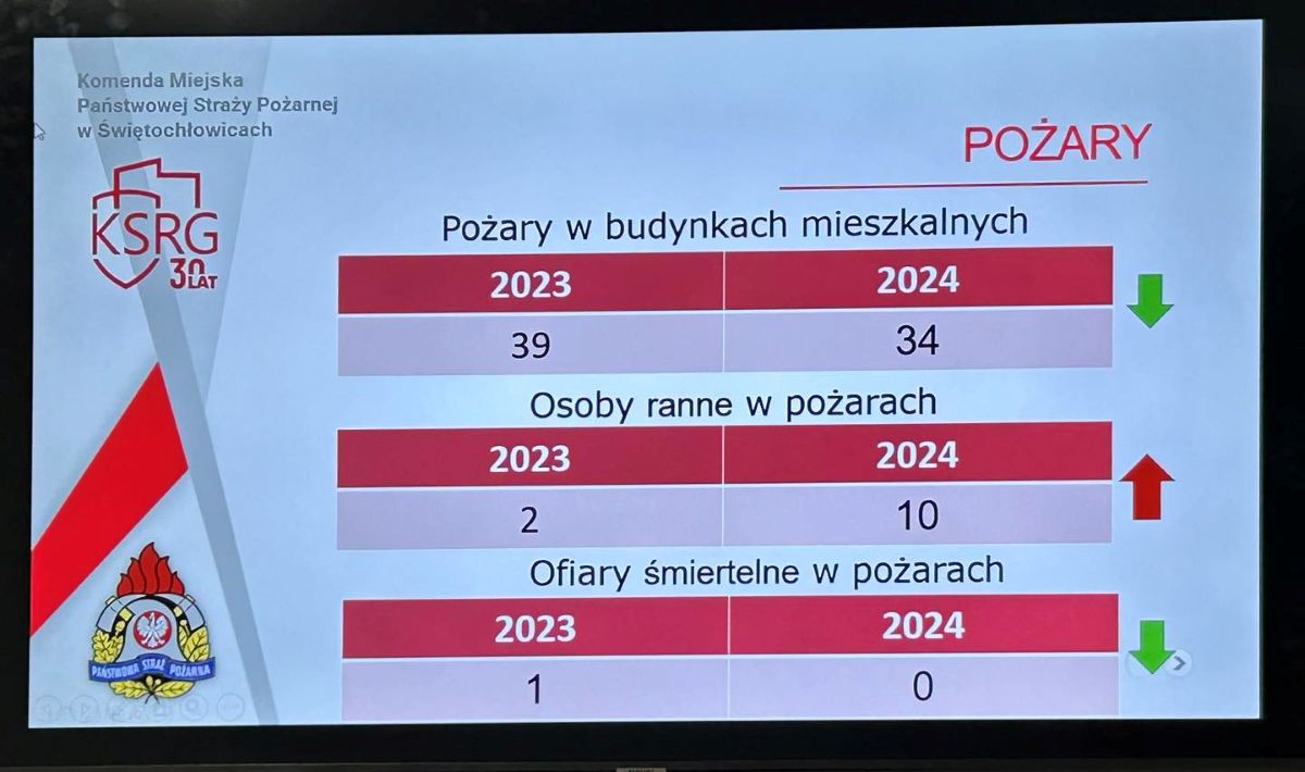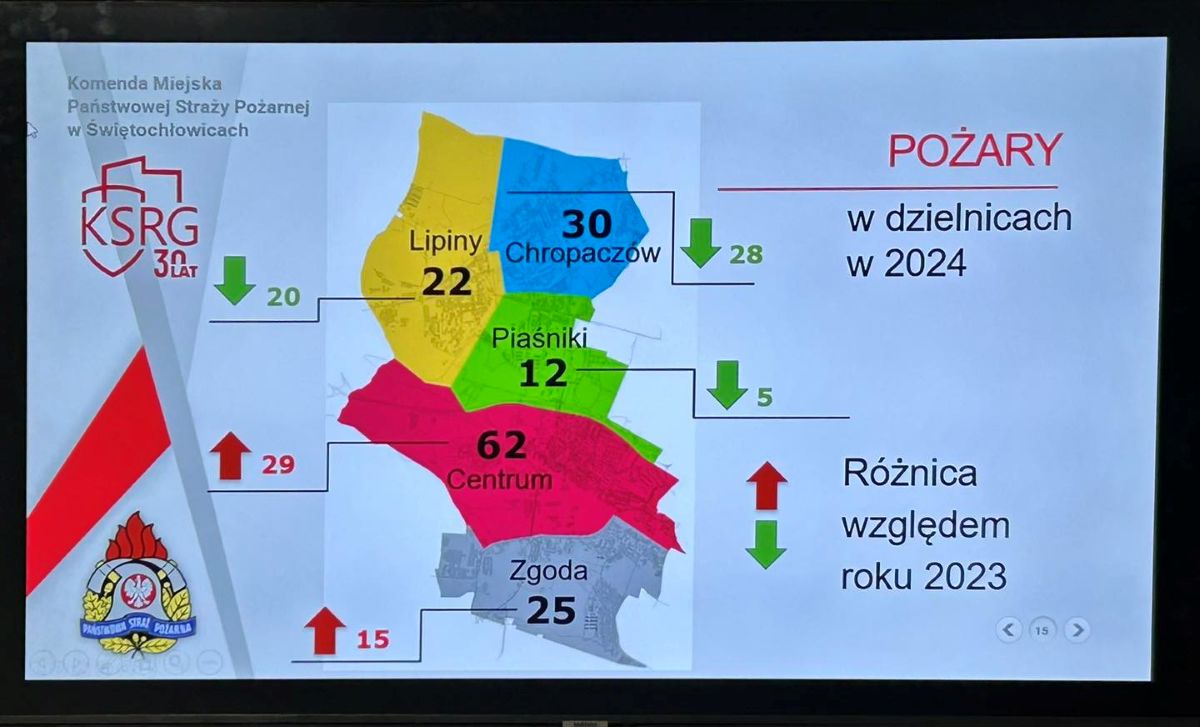 Z przedstawionej podczas sprawozdania prezentacji wynika, że sytuacja się poprawiła. W dzielnicach Lipiny, Piaśniki i Chropaczów odnotowano spadek liczby pożarów. W Lipinach było ich o 20 mniej niż w 2023 roku, wPiaśnikach – o 5 mniej, a w Chropaczowie – o 28 mniej. Niestety wzrost liczby pożarów odnotowano w Centrum (o 29 więcej) oraz na Zgodzie (o 15 więcej).