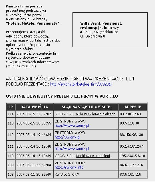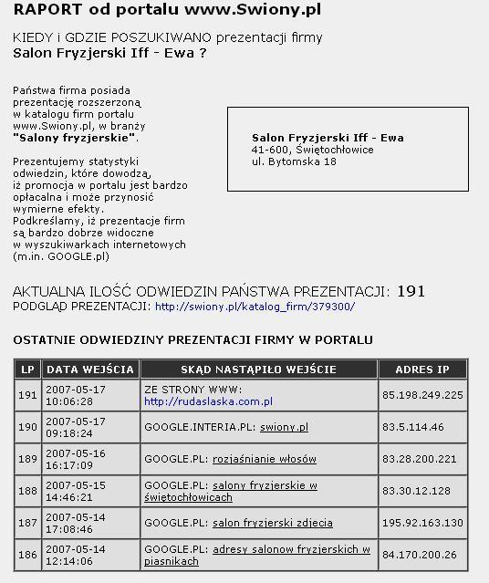 GOOGLE: oznacza, że osoba o podanym adresie IP wpisując [poszukiwane słowa] w wyszukiwarce google.pl, znalazła link do prezentacji Państwa firmy w portalu www.swiony.pl