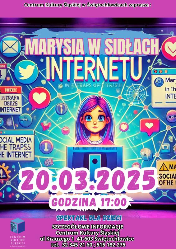 20 marca o godzinie 17:00 w Centrum Kultury Śląskiej w Świętochłowicach odbędzie się wyjątkowy spektakl dla dzieci – “Marysia w sidłach Internetu”.