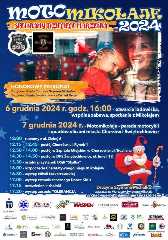 Dzieci z chorzowskiej onkologii otrzymają od Mikołajów na pięknych saniach i motorach cudowne upominki. Następnie MotoMikołaje pojadą do świętochłowickiego Domu Pomocy Społecznej “Złota Jesień”, by sprawić radość seniorom. Później ulicami miasta przejedzie parada motocykli i quadów.