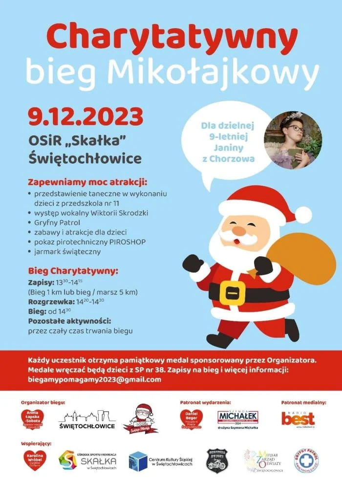 Miasto Świętochłowice wraz z Fundacją Przyjaciół Św. Mikołaja zapraszają do udziału w prawdziwie wyjątkowym biegu. Trasa może wynosić 1 km (dla biegających) lub 5 km (dla biegających lub maszerujących). Bieg rozpocznie się o 14:30. Wcześniej, od 13:30 do 14:15 będą odbywały się ostatnie zapisy. Każdy z uczestników otrzyma pamiątkowy medal – nagrody będą wręczali uczniowie ze Szkoły Podstawowej nr 38. Dochód zebrany podczas wydarzenia zostanie przekazany na leczenie Janiny, 9-latki z Chorzowa.