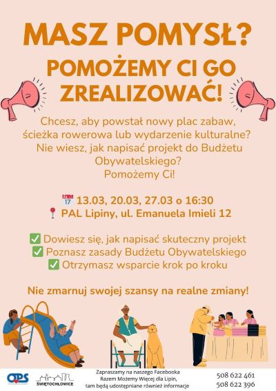 Masz pomysł na zmiany w swojej okolicy, ale nie wiesz, jak go zrealizować? Program Aktywności Lokalnej „PAL dla Lipin” zaprasza na warsztaty, podczas których dowiesz się, jak skutecznie napisać projekt do Budżetu Obywatelskiego.
