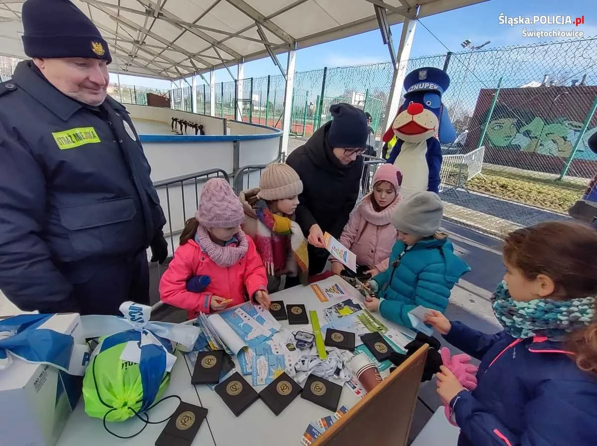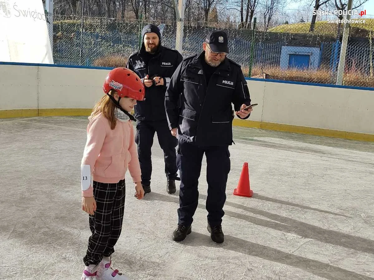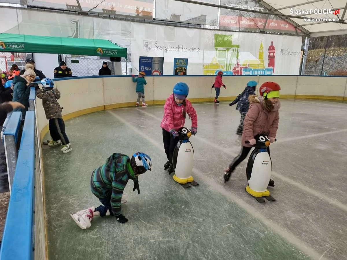 O godzinie 12:30 odbyły się „Pingwinkowe zawody” dla podopiecznych półkolonii ZSO przy ulicy Sudeckiej w Świętochłowicach. Dzieci miały okazję sprawdzić poziom swoich umiejętności jazdy na łyżwach podczas współzawodnictwa. Do rywalizacji przystąpiło 17 osób. Każdy z uczestników miał w najkrótszym czasie pokonać slalomem 6 pingwinków w jedną i drugą stronę. Na najlepszych czekały ciekawe nagrody w postaci kasków narciarskich i dyplomów. Pozostali uczestnicy otrzymali drobne upominki, wręczane przez świętochłowickich mundurowych i Strażników Miejskich.