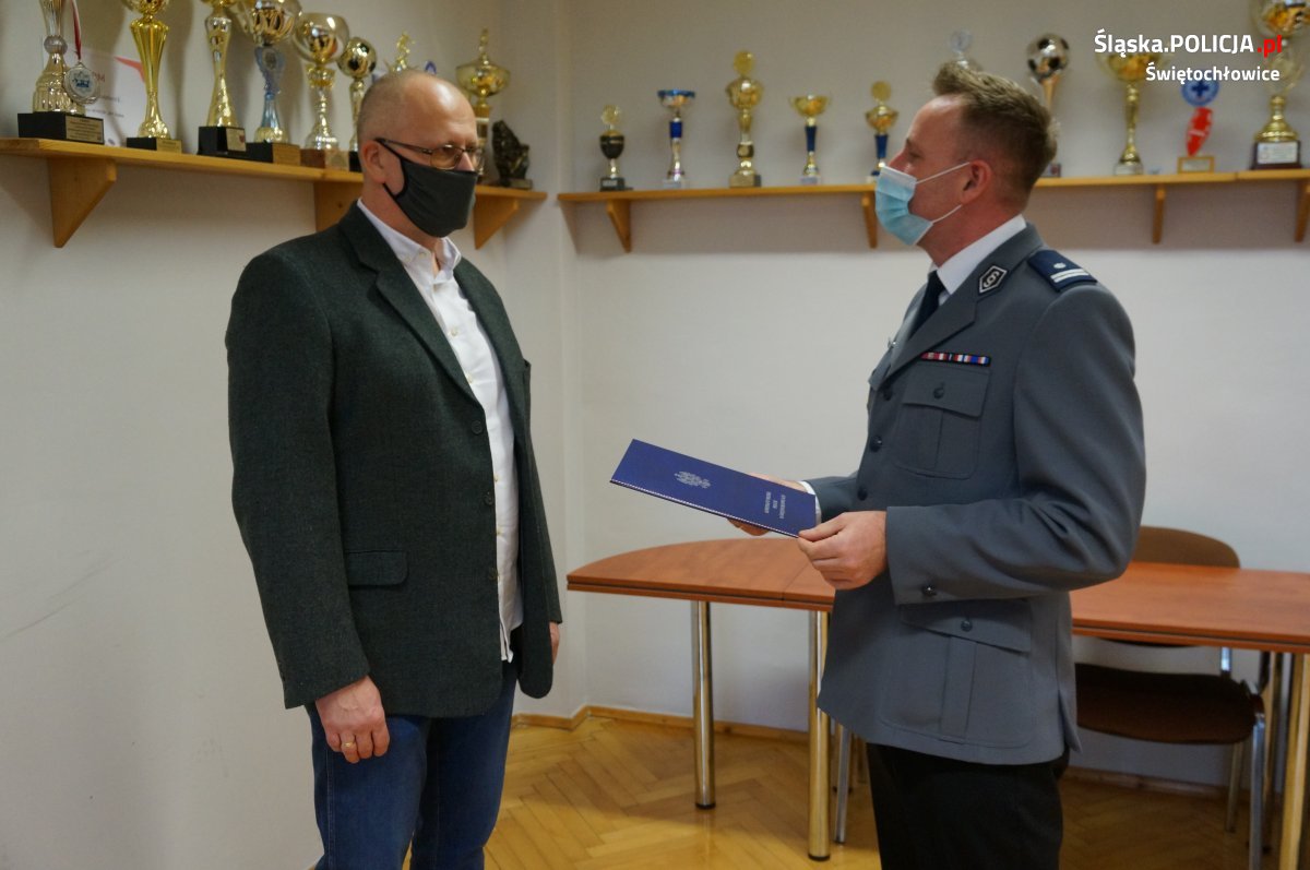 W minioną środę w Komendzie Miejskiej Policji w Świętochłowicach odbyła się skromna uroczystość z zachowaniem reżimu sanitarnego, podczas której Komendant Miejski Policji w Świętochłowicach podinspektor Dawid Gil oraz jego Pierwszy Zastępca młodszy inspektor Monika Francikowska podziękowali Naczelnikowi, a także Pani Aspirant za wspólną służbę oraz za osobiste zaangażowanie w realizację codziennych zadań. Za profesjonalizm, doświadczenie, wiedzę i cenne wskazówki, którymi dzielili się z innymi policjantami, nie odmawiając przy tym nikomu pomocy. Ponadto Naczelnikowi za zrozumienie, wsparcie i szacunek wobec każdego z podwładnych. Do życzeń przyłączył się obecny podczas uroczystości Prokurator Rejonowy w Chorzowie Pan Cezary Golik, który również wyraził słowa uznania za zaangażowanie policjantów oraz osiągnięty staż służby w policyjnym mundurze, dziękując przy tym za dotychczasową współpracę na wysokim poziomie.