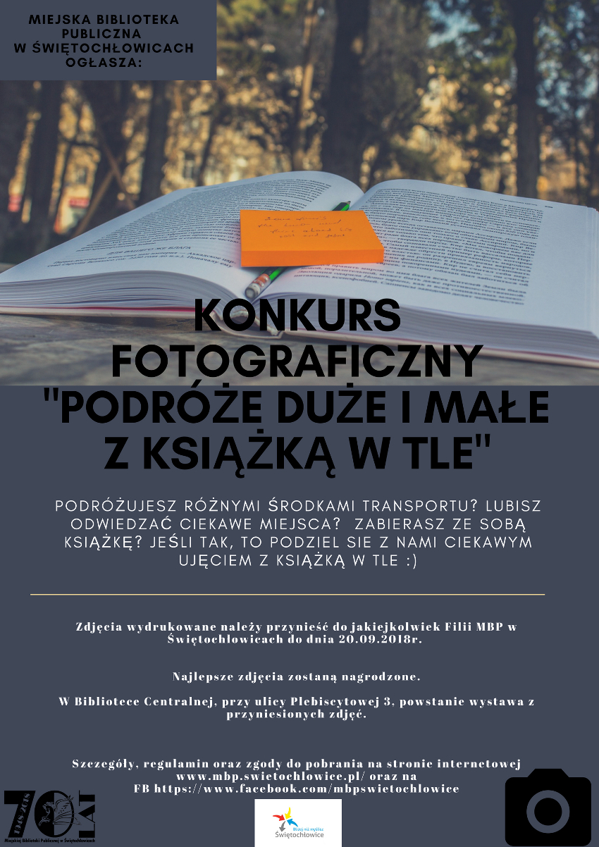 Miejska Biblioteka Publiczna w Świętochłowicach ogłasza konkurs fotograficzny „Podróże duże i małe z książką w tle” dla czytelników i mieszkańców miasta Świętochłowice.