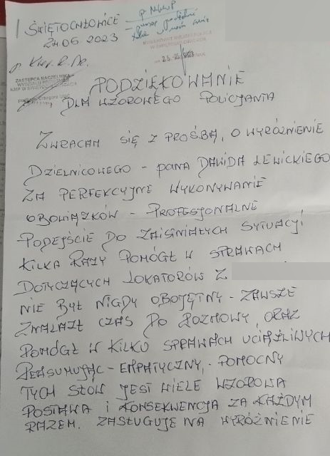 „Zwracam się z prośbą o wyróżnienie dzielnicowego – Pana Dawida Lewickiego”.