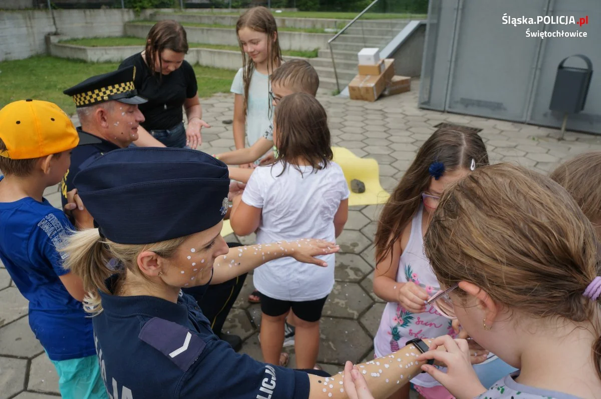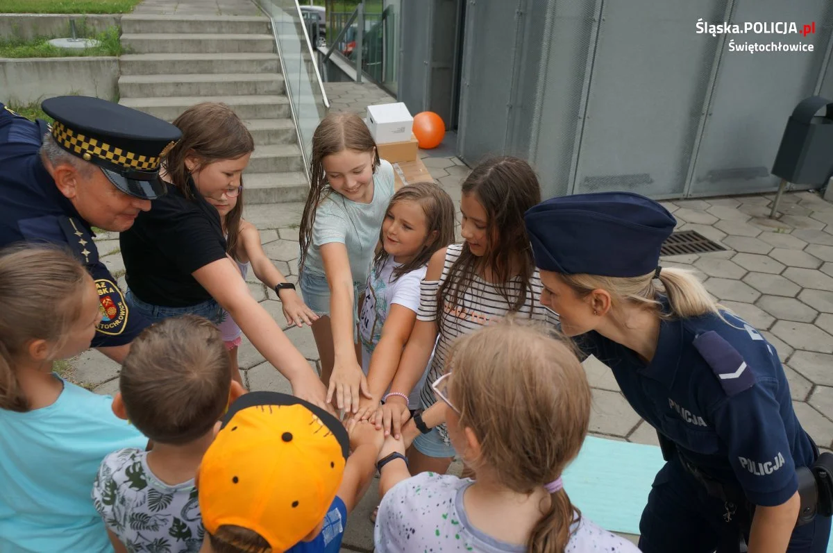 Profilaktycy z miejscowej Policji oraz Straży Miejskiej odwiedzili dzieci uczestniczące w zajęciach wakacyjnych na terenie Wież KWK Polska. Mundurowi zorganizowali dzieciom gry i zabawy, by zachęcić je do zdrowego i aktywnego trybu życia i jednocześnie przestrzec przed negatywnymi skutkami eksperymentowania z używkami. Spotkanie to było świetną okazją także do porozmawiania z dzieciakami o zasadach bezpiecznego wypoczynku i zabawy w trakcie trwających wakacji.