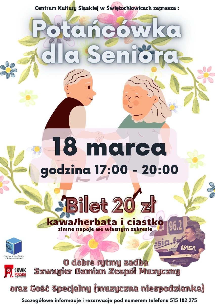 Już w piątek 18 marca zapraszamy na Potańcówkę dla Seniora. Po sukcesie jakim okazała się Potańcówka dla Babci i Dziadka, zgodnie z zapowiedziami, CKŚ Świętochłowice pragnie zaprosić Państwa 18 marca, o godzinie 17:00 do CKŚ. Bilet wstępu obejmujący kawę/herbatę, ciastko i dobrą zabawę do nabycia w Sekretariacie CKŚ w godzinach od 8:00 – 15:00. Zagra dla Państwa Szwagier Damian Zespół Muzyczny oraz nasz niezastąpiony DJ – Pan Realizator.