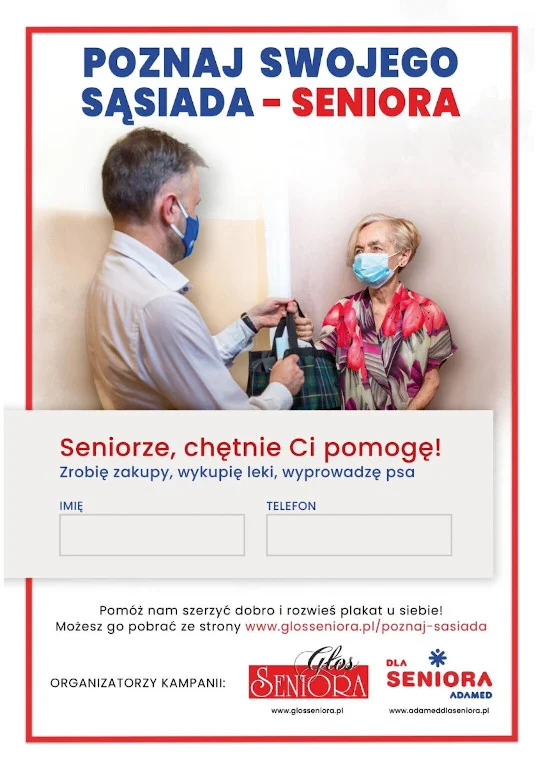 Reagując na bieżącą sytuację społeczną, Głos Seniora razem z Adamed Dla Seniora inaugurują nową akcję społeczną POZNAJ SWOJEGO SĄSIADA-SENIORA. W ten sposób promujemy pomoc sąsiedzką dla potrzebujących seniorów i apelujemy do wszystkich osób, aby włączyły się w akcję wsparcia sąsiada-seniora.