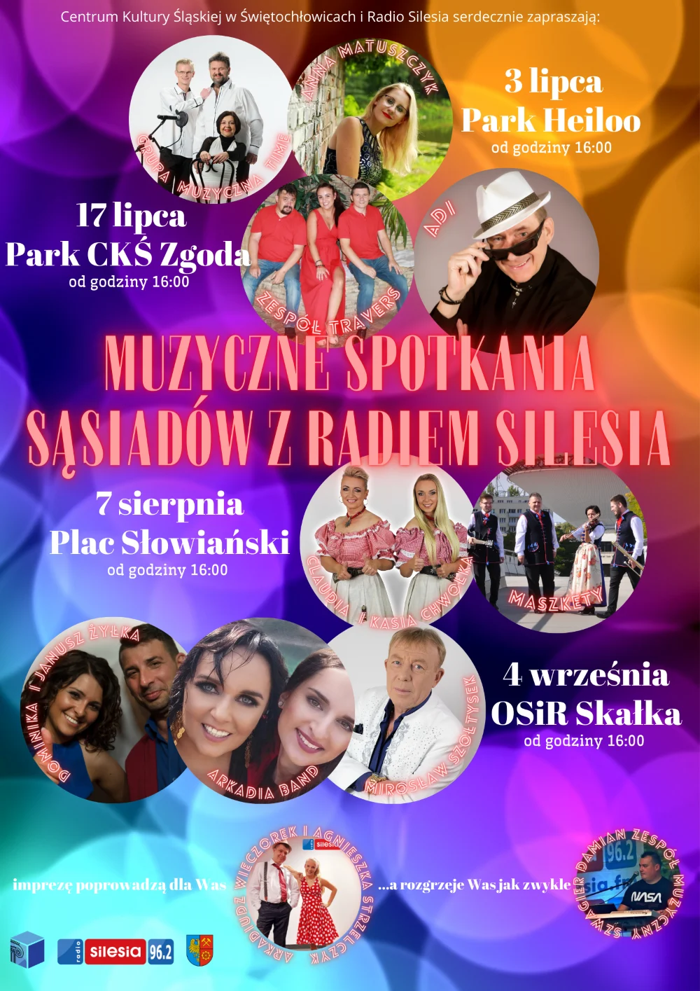 Cykl Muzycznych Spotkań Sąsiadów z Radiem Silesia rozpoczyna się już w ten weekend, zakończy się zaś dopiero we wrześniu. W kilku świętochłowickich lokacjach wystąpią m.in. Claudia i Kasia Chwołka, Maszkety, Arkadia Band a także Mirosław Szołtysek. Imprezy poprowadzą Arkadiusz Wieczorek i Agnieszka Strzelczyk, a za oprawę muzyczną odpowiada Szwagier Damian Zespół Muzyczny.