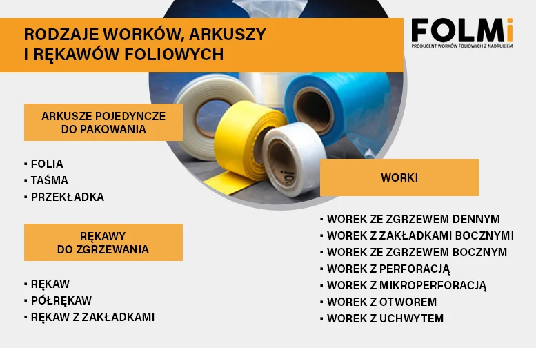- folie – proste odcinki folii o wybranej szerokości i grubości. Można zastosować je jako plandeki, osłony lub ostateczne opakowania produktów niewymiarowych o znacznych gabarytach;