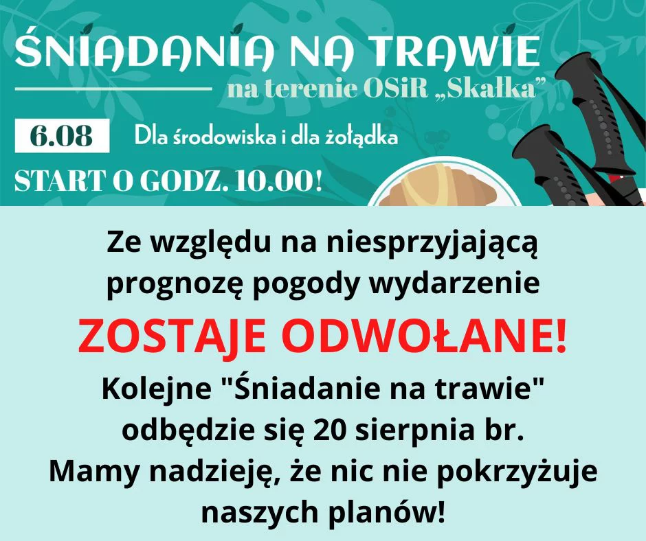 Niestety, ze względu na niesprzyjającą prognozę pogody, jutrzejsze “Śniadanie na trawie” na OSiR Skałka zostaje odwołane! Kolejne tego typu wydarzenie odbędzie się 20 sierpnia.