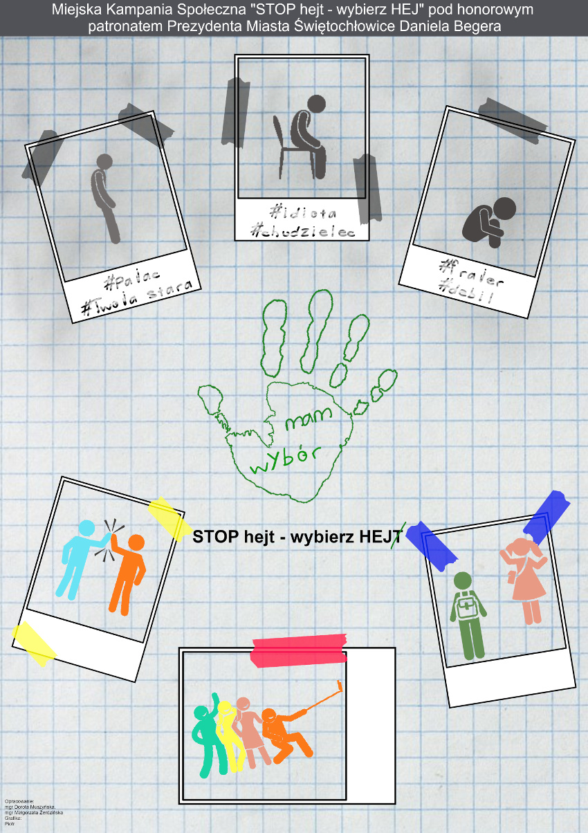 Miejski Zarząd Oświaty przy współudziale Poradni Psychologiczno – Pedagogicznej w Świętochłowicach, Regionalnego Ośrodka Metodyczno -Edukacyjnego „Metis” w Katowicach, pedagogów i psychologów szkolnych oraz Młodzieżowego Domu Kultury w Świętochłowicach organizuje Miejską Kampanię Społeczną pod hasłem „STOP hejt – wybierz HEJ”, pod honorowym patronatem Prezydenta Miasta Świętochłowice Daniela Begera.