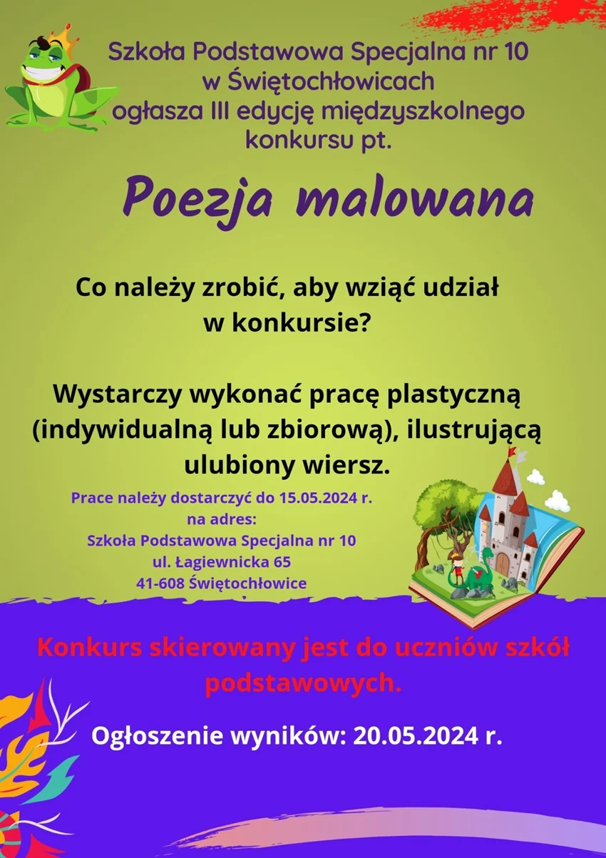 Szkoła Podstawowa Specjalna nr 10 w Świętochłowicach ogłasza III edycję międzyszkolnego konkursu pt. „Poezja malowana”.