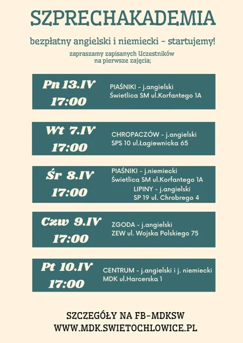 - Pt 10.IV, godz. 17:00 – Centrum, język angielski i język niemiecki, MDK, ul. Harcerska 1