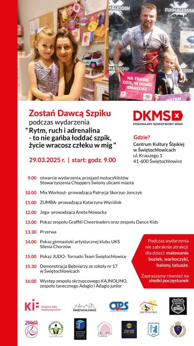 Władze miasta zapraszają 29 marca w godz. 9.00-17.00 na wydarzenie “Zostań Dawcą Szpiku podczas wydarzenia – rytm, ruch i adrenalina”, które odbędzie się w CKŚ w Świętochłowicach.