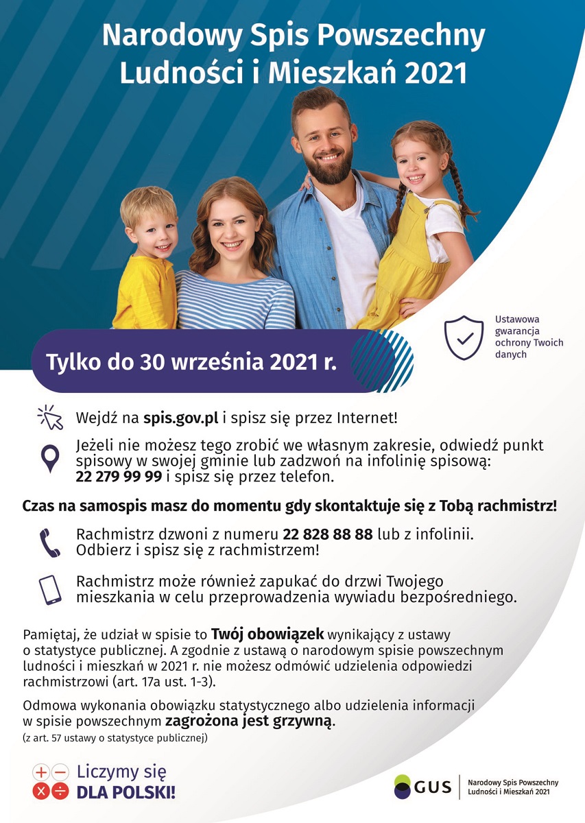 Pamiętaj, że udział w spisie to Twój obowiązek wynikający z ustawy o narodowym spisie powszechnym ludności i mieszkań w 2021 r. Odmowa udziału w spisie powszechnym grozi karą grzywny na podstawie art. 57 ustawy o statystyce publicznej.