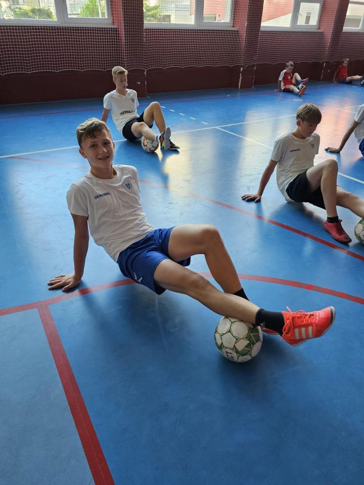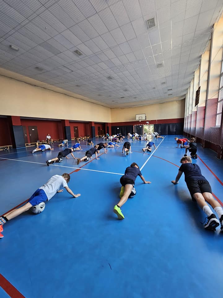 Młodzi sportowcy rozpoczęli dzień wczesną pobudką i pełnym energii rozruchem na hali, przygotowując się do intensywnego dnia pełnego treningów i zabawy. Poranny trening skupiał się głównie na doskonaleniu techniki oraz umiejętności motorycznych, które stanowią klucz do sukcesu na boisku.