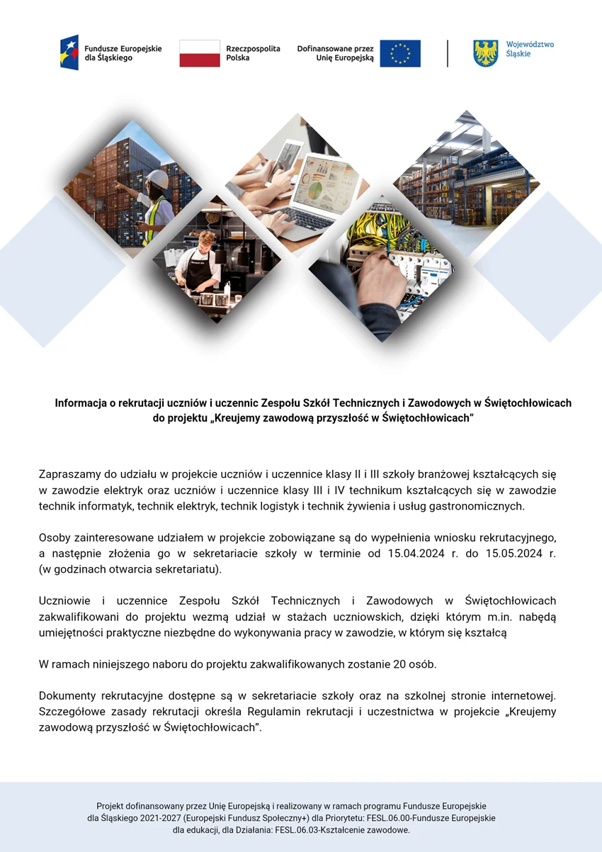 Urząd Miasta Świętochłowice zaprasza uczniów i uczennice Zespołu Szkół Technicznych i Zawodowych w Świętochłowicach do projektu „Kreujemy zawodową przyszłość w Świętochłowicach”.
