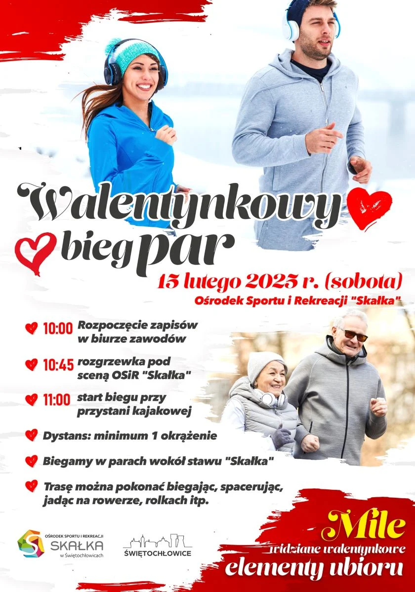 Dzień po Walentynkach w Świętochłowicach odbędzie się Walentynkowy bieg par. To dobra okazja do spędzenia przyjemnego czasu ze swoją drugą połówką w sportowej atmosferze. Całą trasę można pokonać na różne sposoby: biegając, spacerując, jadąc na rowerze czy rolkach. Jeśli chodzi o dystans, to wynosi on minimum jedno okrążenie wokół stawu „Skałka”.