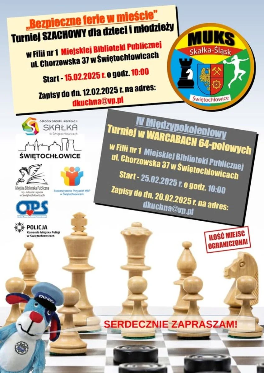 Tego dnia nie może zabraknąć również szachów! O godzinie 10:00 odbędzie się Turniej szachowy dla dzieci i młodzieży w ramach „Bezpiecznych ferii w mieście”. Wydarzenie odbędzie się w Filii nr 1 Miejskiej Biblioteki Publicznej w Świętochłowicach przy ul. Chorzowskiej 37. Aby wziąć udział w turnieju, należy się zapisać do 12 lutego na adres [email protected]