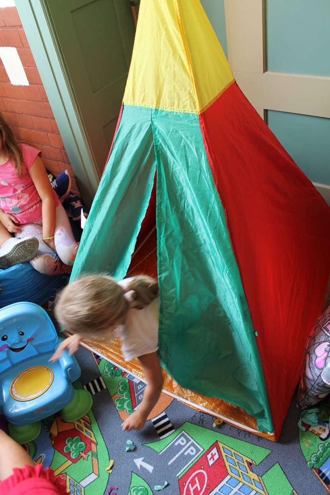 Specjalnie przygotowany kącik dziecięcy, to przestrzeń, w której królować będą kolorowe, sensoryczne maty oraz wygodne, miękkie poduszki do siedzenia uszyte przez uczestników z grupy krawieckiej działającej w ramach Centrum.
