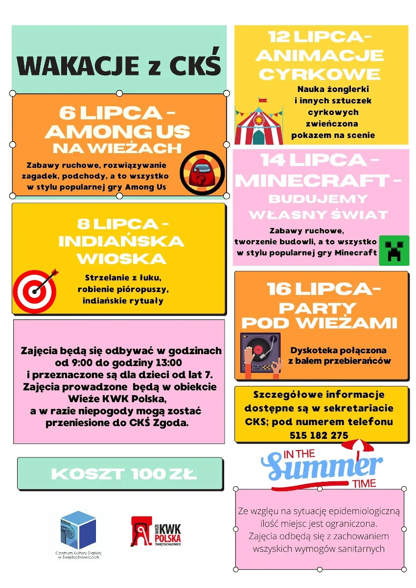 Centrum Kultury Śląskiej zaprasza wszystkie dzieci i młodzież do udziału w wakacyjnych zajęciach, które będą odbędą się w obiekcie Wieże KWK Polska, a w razie niesprzyjających warunków atmosferycznych będą przeniesione do CKŚ Zgoda.