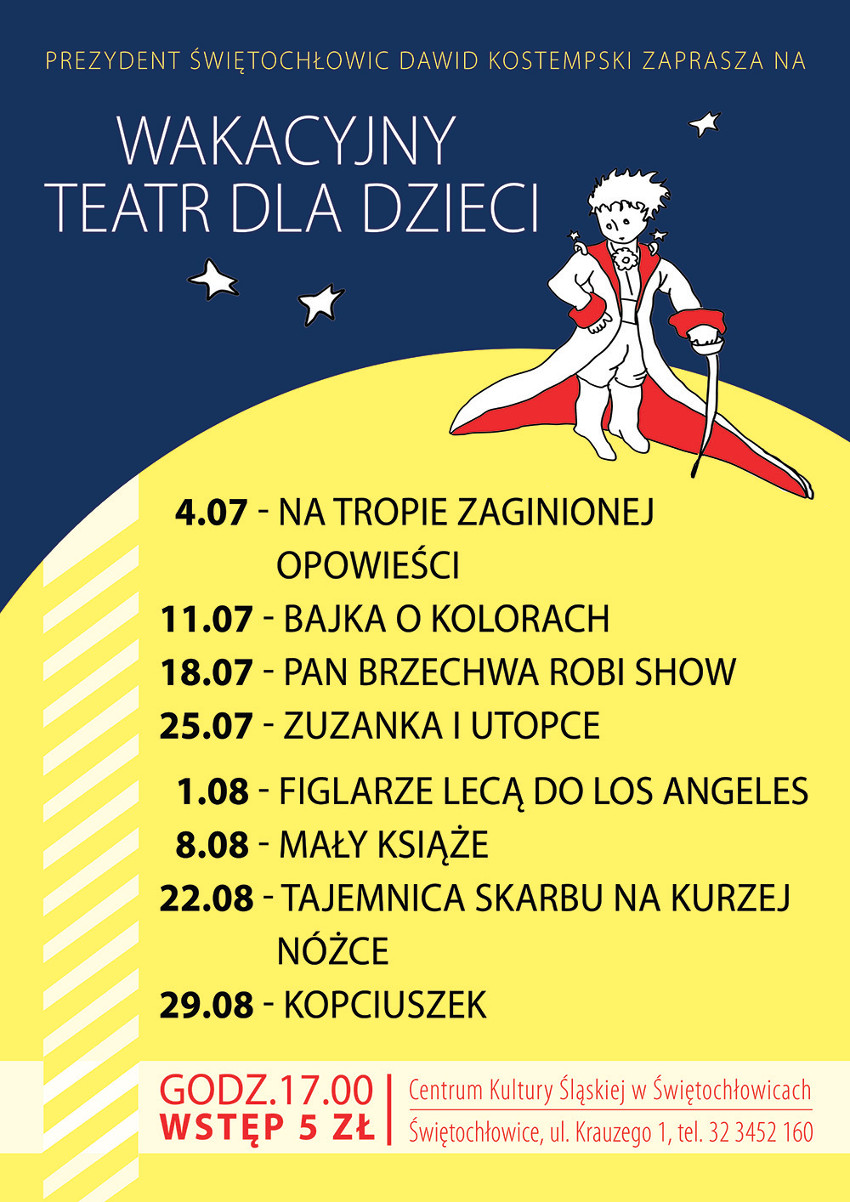 Wakacyjny teatr dla dzieci już w lipcu i sierpniu! Zapraszamy dzieci do teatru. Spektakle wystawiane będą w Centrum Kultury Śląskiej w lipcu i sierpniu o godz. 17.00.Szczegóły na plakacie.Tagi:SpektaklCKŚWydarzeniaWakacje