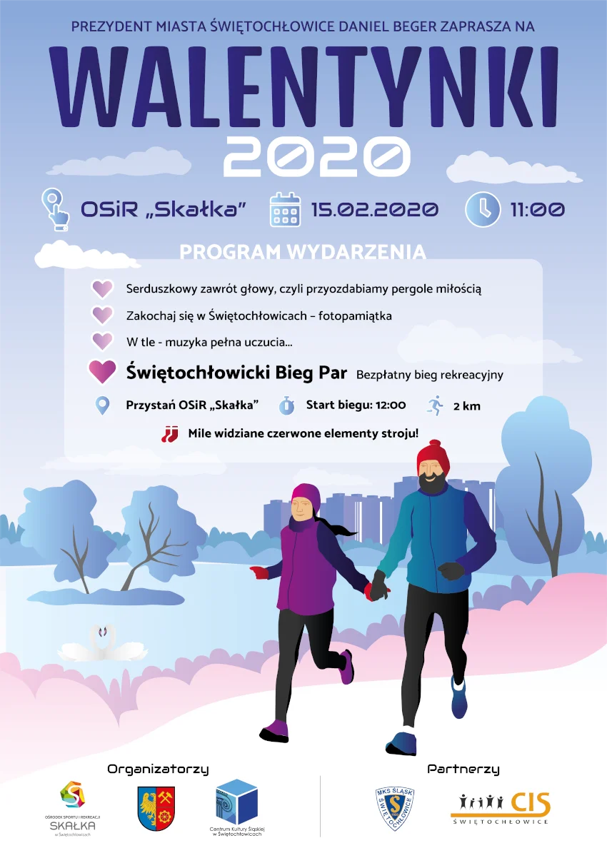 - Świętochłowicki Bieg Par – bezpłatny bieg rekreacyjny na dystansie 2 km – pamiętajcie, że mimo iż jest to bieg walentynkowy to parę możecie stworzyć z dzieckiem, rodzicem, babcią, teściową czy nawet pieskiem; jeżeli kondycja Wam nie pozwala przebiegnąć – zawsze możecie przejść spacerkiem (to tylko dwa kółka wokół stawu Skałka); kijki do nordic walking nie stanowią pary