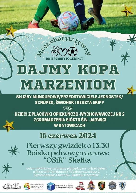 Uwaga – o 13.30 Urząd Miasta zaprasza na OSiR Skałka na mecz charytatywny “Dajemy kopa marzeniom”, w którym zagrają mundurowi i prezydent miasta oraz maskotki służb! Gramy dla dzieci!