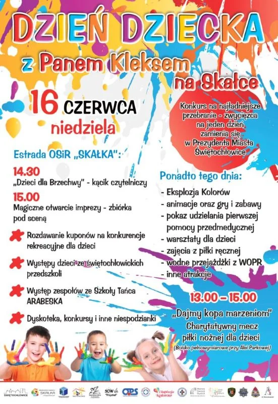 Tegoroczny Dzień Dziecka w Świętochłowicach z powodu warunków pogodowych został przełożony i obchodzony będzie 16 czerwca na OSiR Skałka. Wydarzenie odbędzie się w klimacie Akademii Pana Kleksa tak lubianej przez najmłodszych! Najpiękniej przebrane dziecko zostanie na 1 dzień prezydentem!
