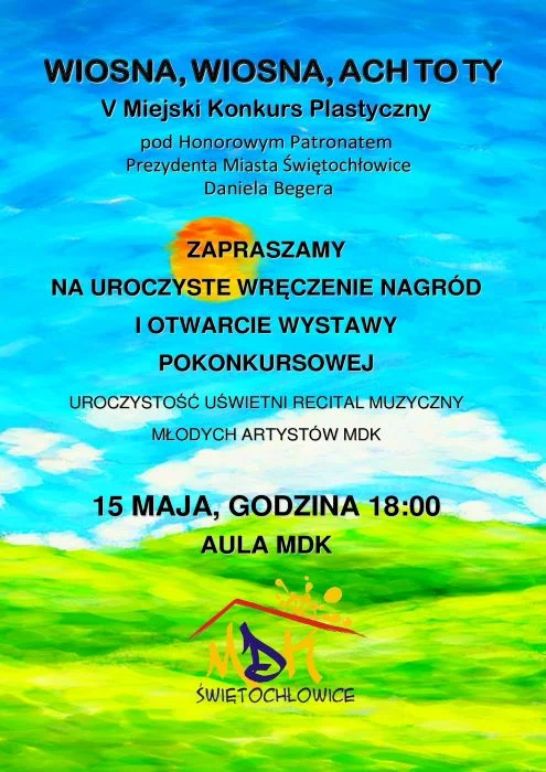 MDK w Świętochłowicach zaprasza 15 maja na otwarcie wystawy i wręczenie nagród w V Miejskim Konkursie Plastycznym „Wiosna, wiosna, ach to ty”. W programie także recital młodych artystów.