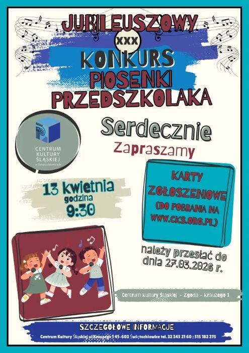 Centrum Kultury Śląskiej w Świętochłowicach zaprasza do udziału w Jubileuszowym XXX Konkursie Piosenki Przedszkolaka. To wydarzenie, które od lat integruje najmłodszych mieszkańców oraz środowiska oświatowe w Świętochłowicach i miastach ościennych.
