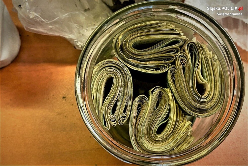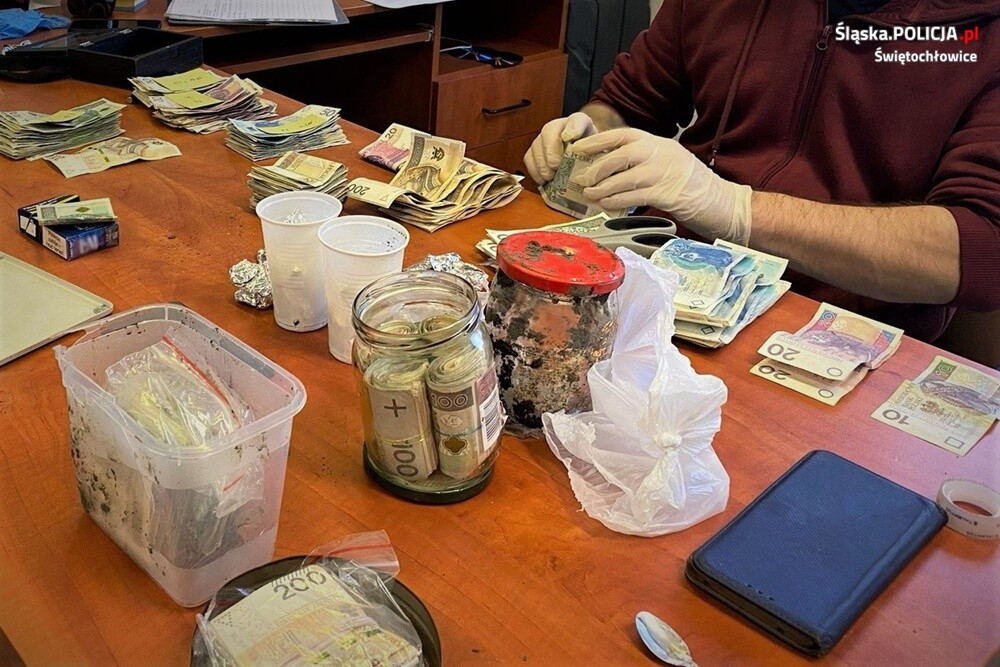 Policjanci, podczas przeszukania mieszkania, samochodu oraz ogródka działkowego zajmowanego przez młodego świętochłowiczanina, zabezpieczyli narkotyki, z których można było przygotować łącznie prawie 11 tysięcy porcji dilerskich różnych środków odurzających o czarnorynkowej wartości prawie 60 tysięcy złotych. Ponadto, na terenie ogródka, oprócz narkotyków, kryminalni znaleźli tam zakopane w ziemi pojemniki z pieniędzmi w kwocie blisko 60 tysięcy złotych.