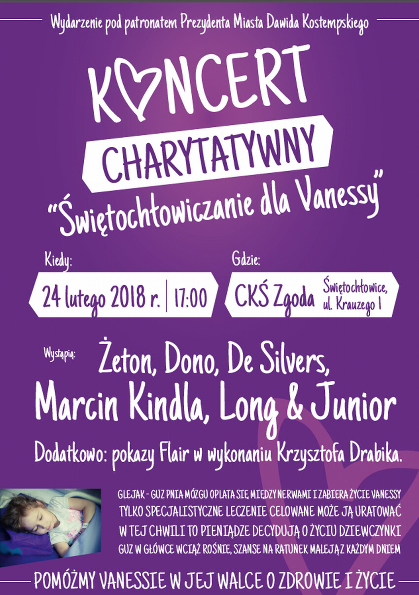 • 24 lutego, godz. 17 Charytatywny Koncert dla Vanessy w Centrum Kultury Śląskiej. Wystąpią m.in.: Żeton, Dono, Krzysztof Drabik, De Silvers, Marcin Kindla, Long&Junior.